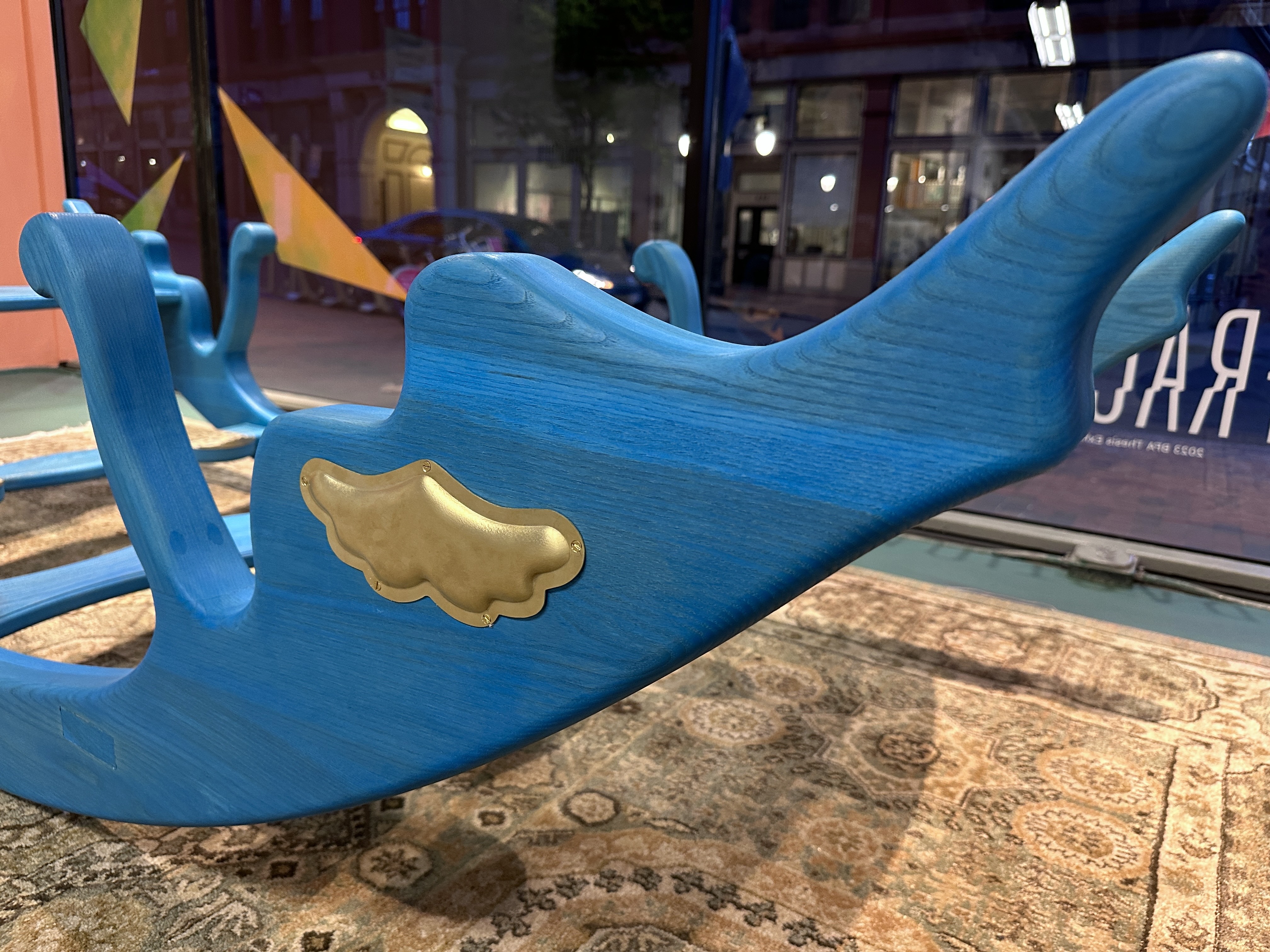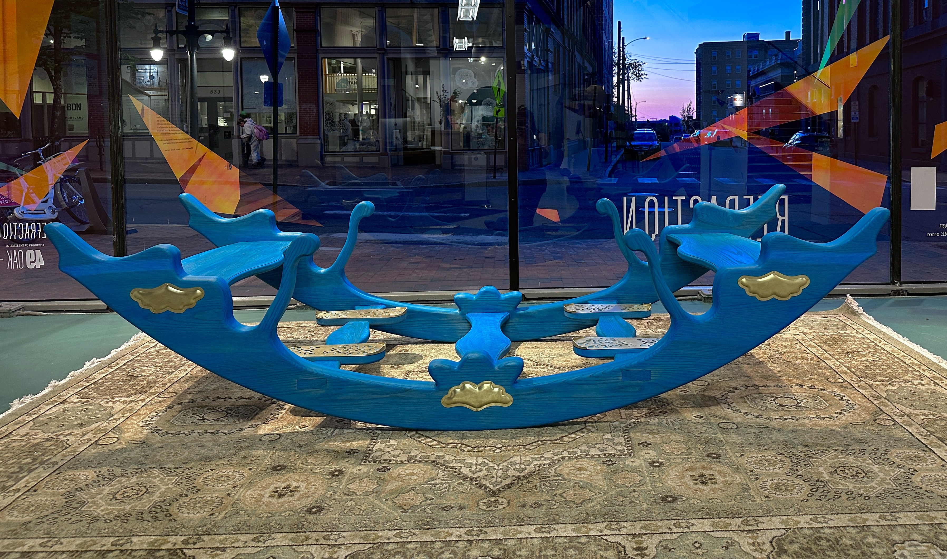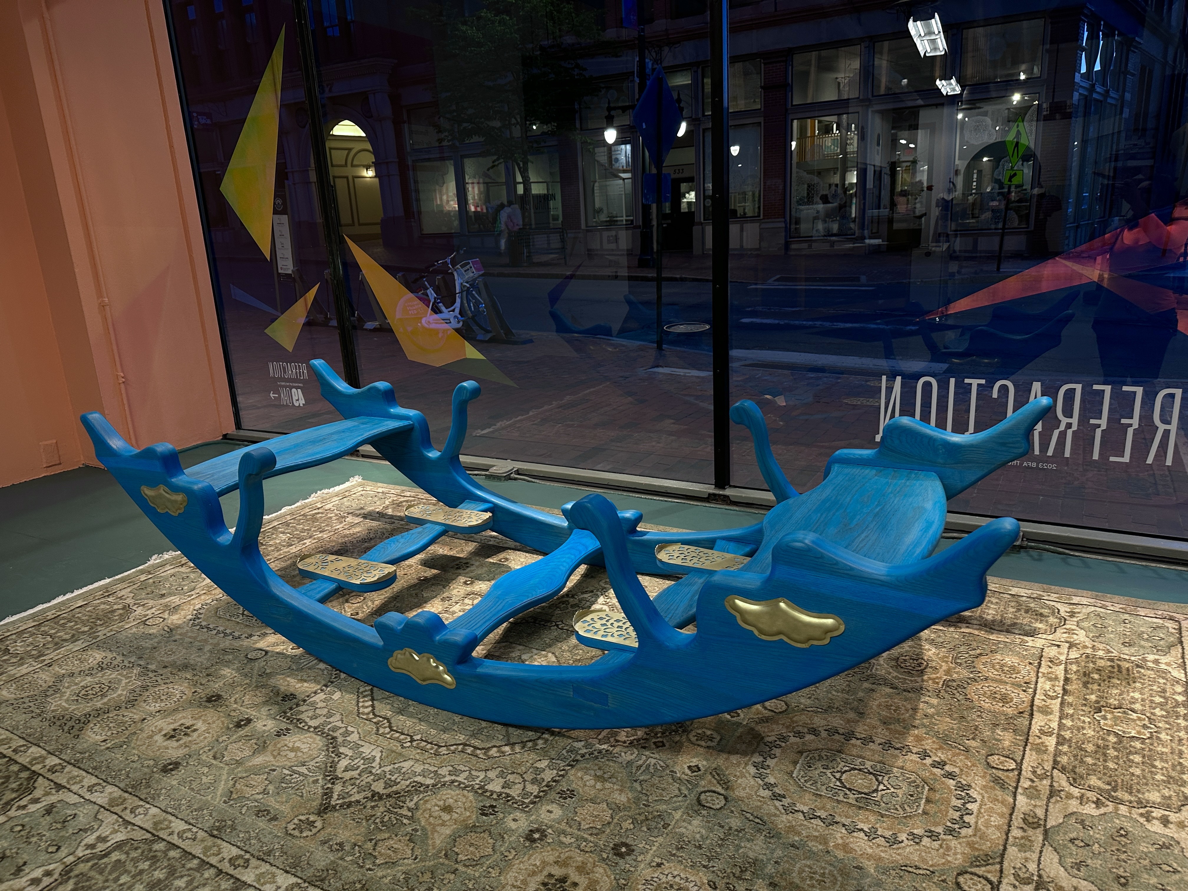 My interest in furniture and how it brings people together was sparked by my visit to Lebanon and my teta’s (grandmother’s) living room. I am fascinated by our relationship with furniture and the spaces we occupy. I designed this piece around the theatricality and ridiculousness of Baroque and Rococo aesthetics, bringing it into the modern era with my own flare. Its highly interactive nature is meant to emphasize the inherent socialization in furniture and explores how furniture objects facilitate emotional responses.This two person rocking chair is made to be used in a variety of ways, sitting or standing. Familiar furniture features and shapes indicate places to rest the body and ways to interact with the object. It requires two bodies to use (or some creative thinking from a single user). It is entirely dependent on human interaction to become a functional object, as when it is not in motion it is completely useless, thus emphasizing the codependent relationship between furniture and our bodies.