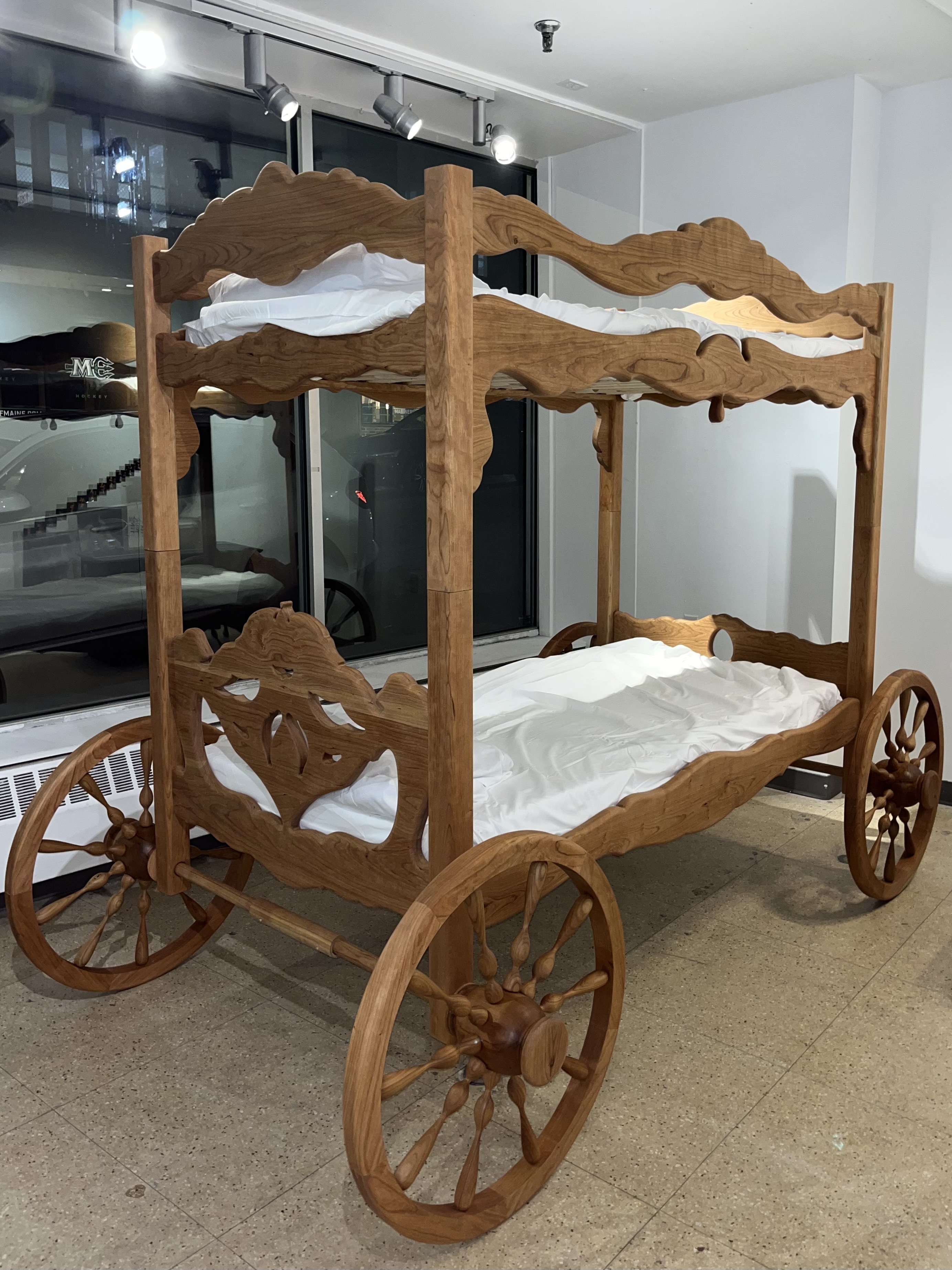 My creative process is an exploration of the playful theme of nostalgia through crafting a functional and sculptural wooden work using traditional furniture techniques. In this work, I’ve selected a piece of furniture that highlights important memories from my youth. I reimagined this item and instilled a narrative that addresses personal familial relations. Typically my work creates a space for two people, as I am often exploring the bond between myself and my twin brother. Through my stylistic decisions, I’ve attempted to create something that is dreamlike and engage with the way we thought as children. This mindset prompts the use of soft, bulbous, and ballooned aesthetics, which push the boundaries of wood as a rigid material and also question the limits of the material. I want the wooden object to feel as if it were malleable and pushed out from the surface plane. The references to farm vernacular, mid-century modern furniture, Renaissance-era framework, contemporary and Art Nouveau architectural design, and contemporary industrial design are utilized as a way of furthering the investigation of themes of nostalgia, childhood, and familial relations.