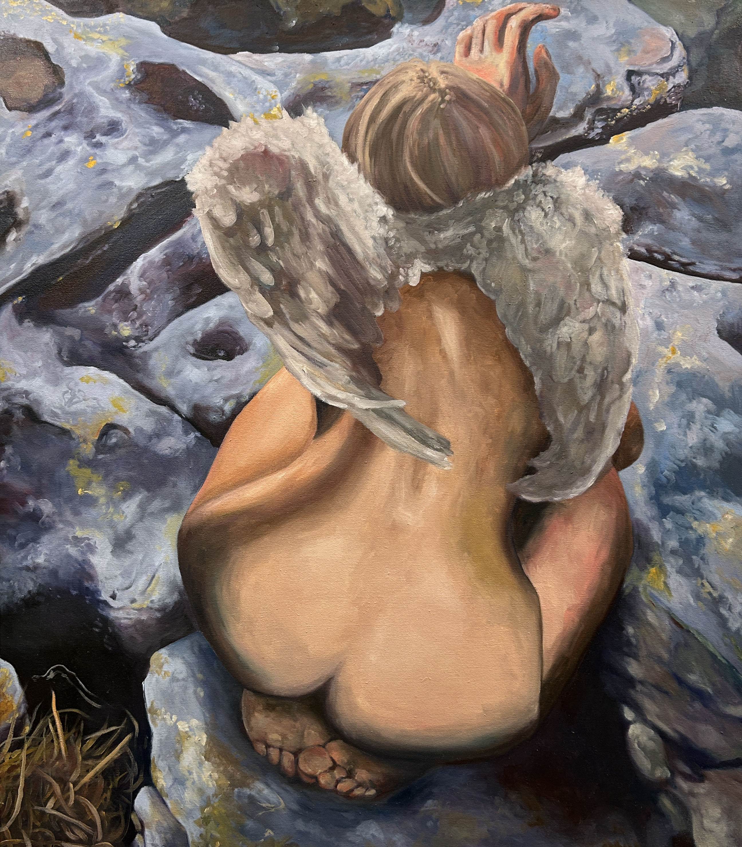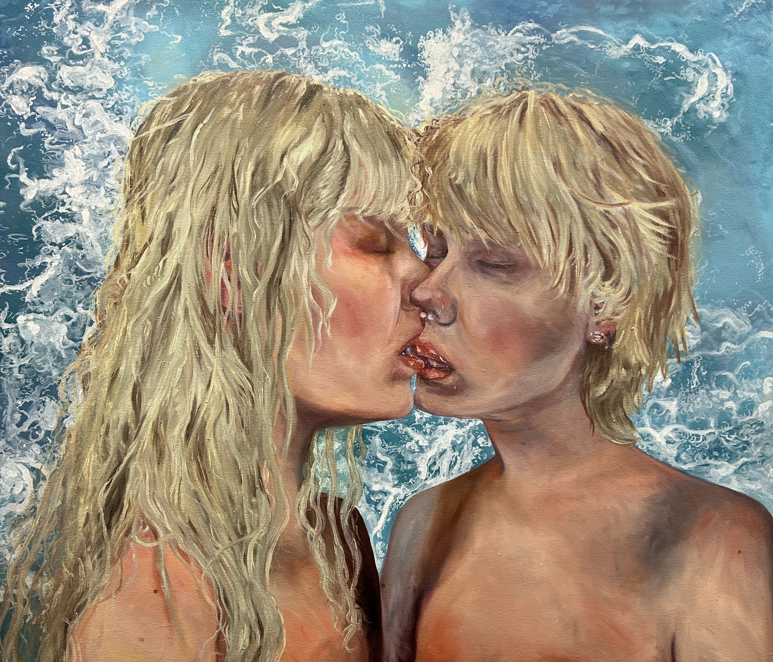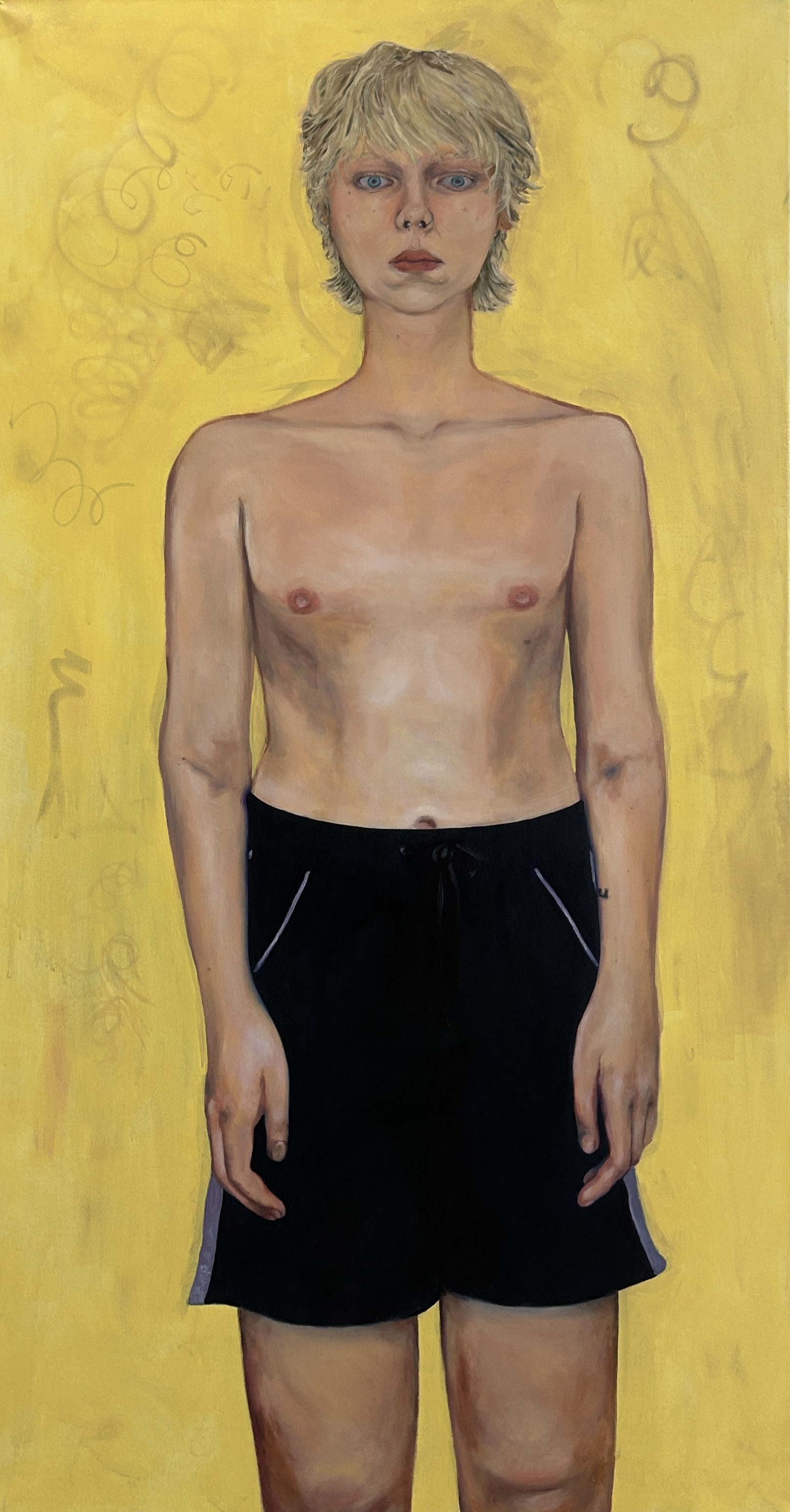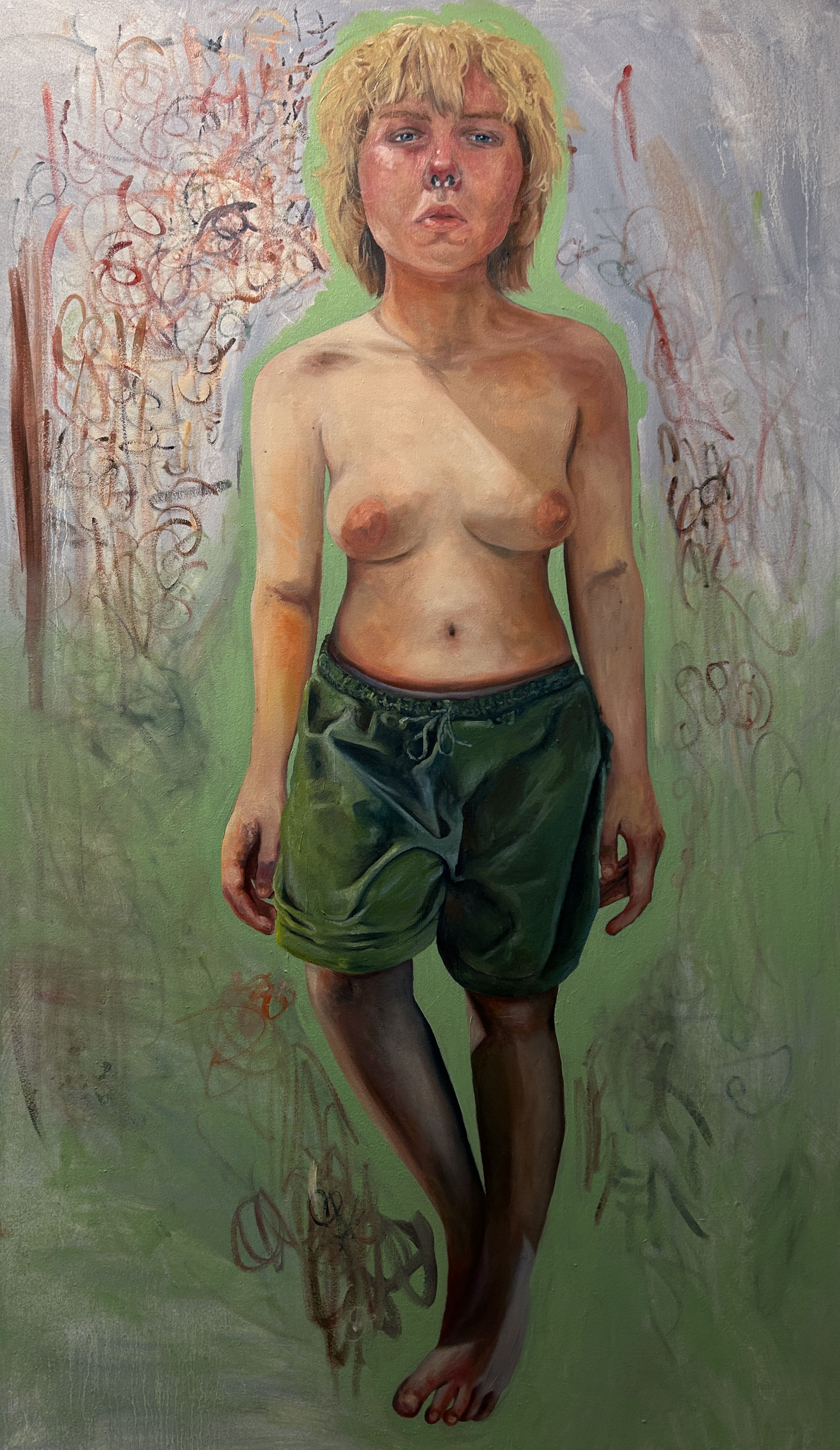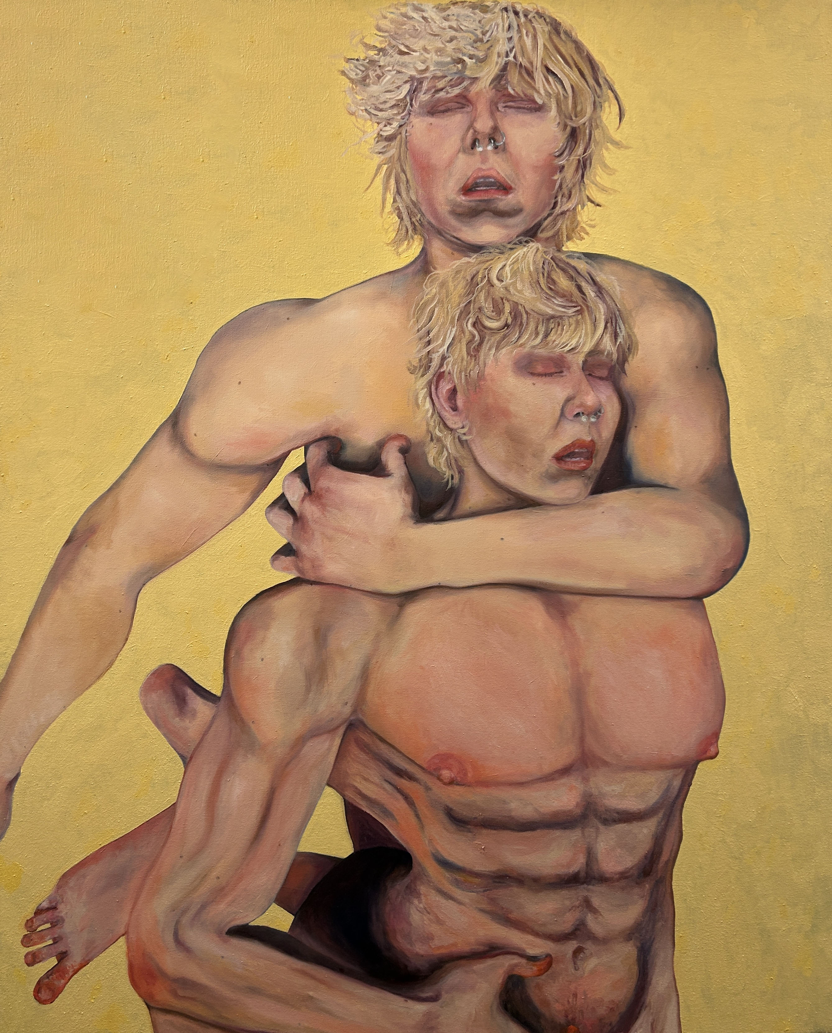 Using oil paint and my obsession with the human body, I make large oil paintings which are attempts at understanding myself. While incorporating themes like gender, sexuality, personal fantasy, and human connection. My paintings are me, they are extensions of myself. I insert myself physically into my paintings, I am my own figure reference. My paintings are my form of communication and connection. I paint for me, and for others who experience similar feelings to me. While my paintings are me, I have always found it difficult to identify myself. I have always felt uncomfortable with my body, my face, my mind. I have always felt like I looked strange. My paintings are the leftovers of my feelings, the anger, sadness, and confusion that never seem to leave my body, they spill into my work. There are questions that are constantly running through my head, how do I look right now? How do I move through this space? How has this space affected me? I paint in an attempt to answer those questions. While I’m constantly trying to find peace within myself, my experiences are a part of me, and my past selves have left their mark. Painting helps me understand.